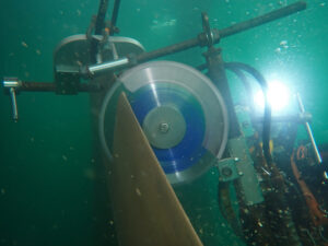 If straightening is not an option, the affected area on the blade will be cropped. This is done to achieve the greatest possible efficiency. This kind of repair is carried out with our propeller blade cutting equipment. First a detailed underwater inspection is performed by a Hydrex diver/ technician team to obtain the exact extent of the damage. This information is then used for a detailed calculation of the ideal cutting line. This allows the customer to know in advance what the result of the operation will be.